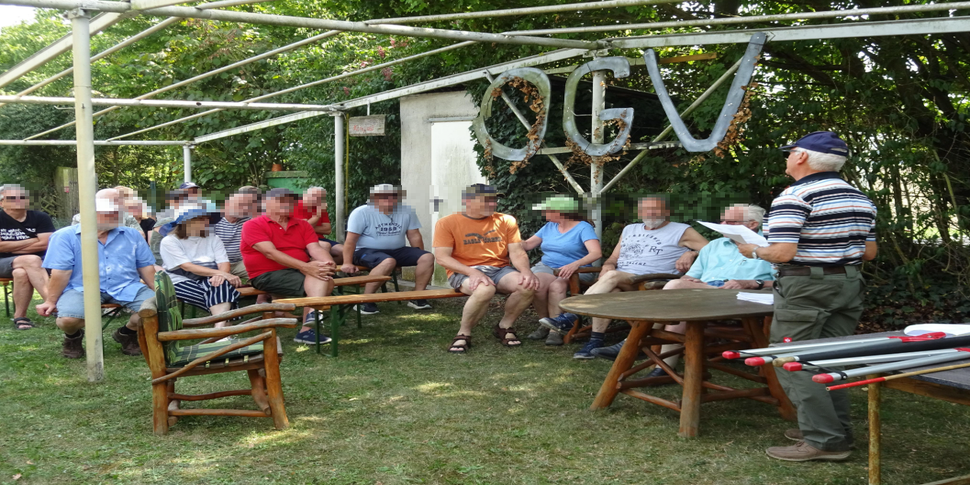 Bei sommerlichen Temperaturen fand die stattliche Anzahl von 29 Besuchern den Weg zum Vereinsgarten des Leeheimer Obst- und Gartenbauvereins, um ihr Wissen zum Thema Obstbaumschnitt aufzufrischen.